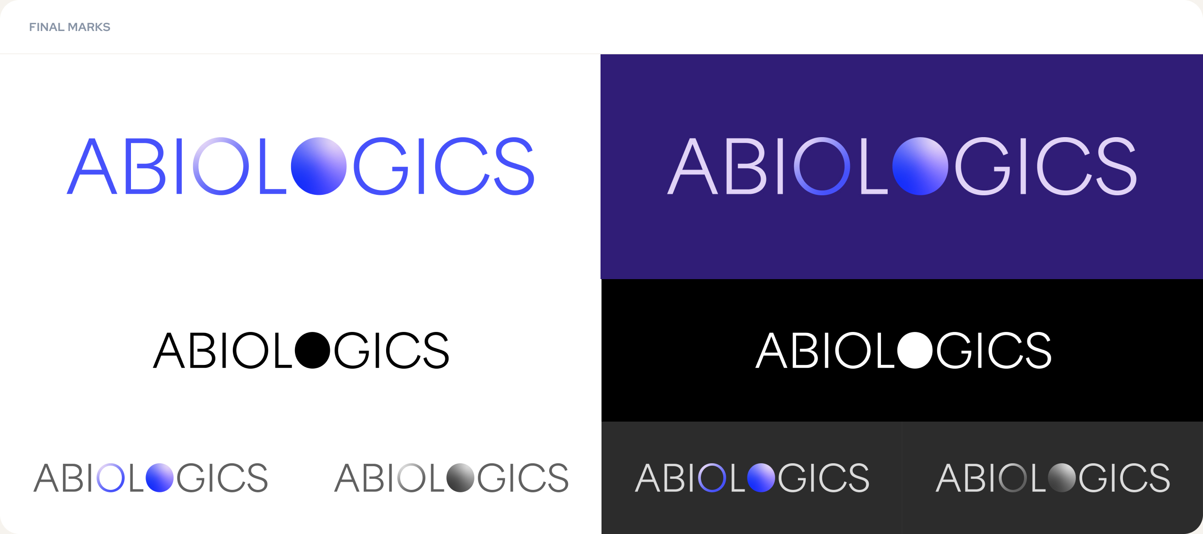 I explored the logo and mark in various mediums and contexts. The logo mark allows for more environments and mediums to incorporate the logo like in the footer of the website. The final mark is used throughout the final website as well as on the branded presentation slides I created for the Abiologics team.