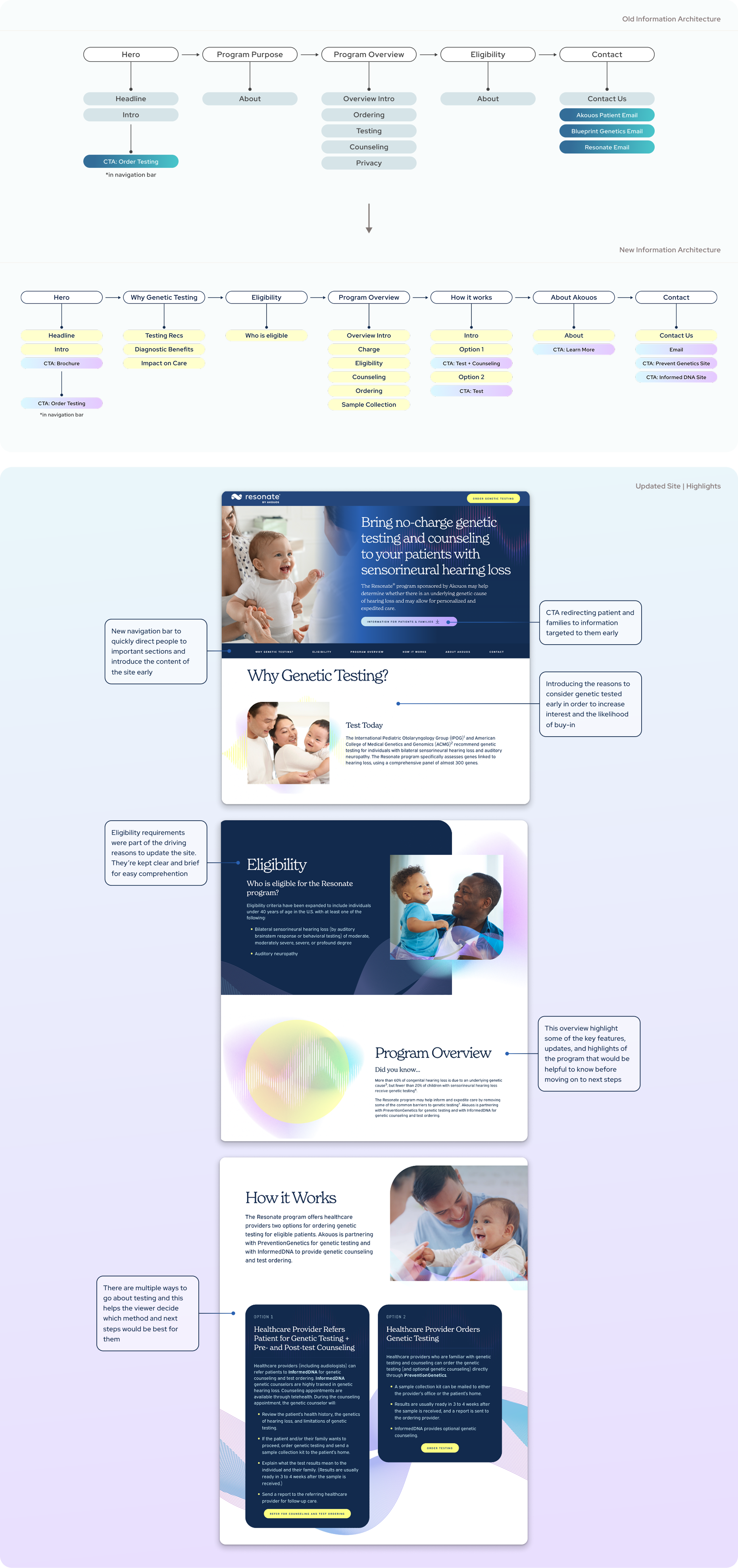 The results of these interviews, the workshops, and a ecosystem analysis produced an updated UX & content strategy plan and information architecture that allowed the client to present the value of genetic testing, information on the program, and how to start the process with the key stakeholders in mind.