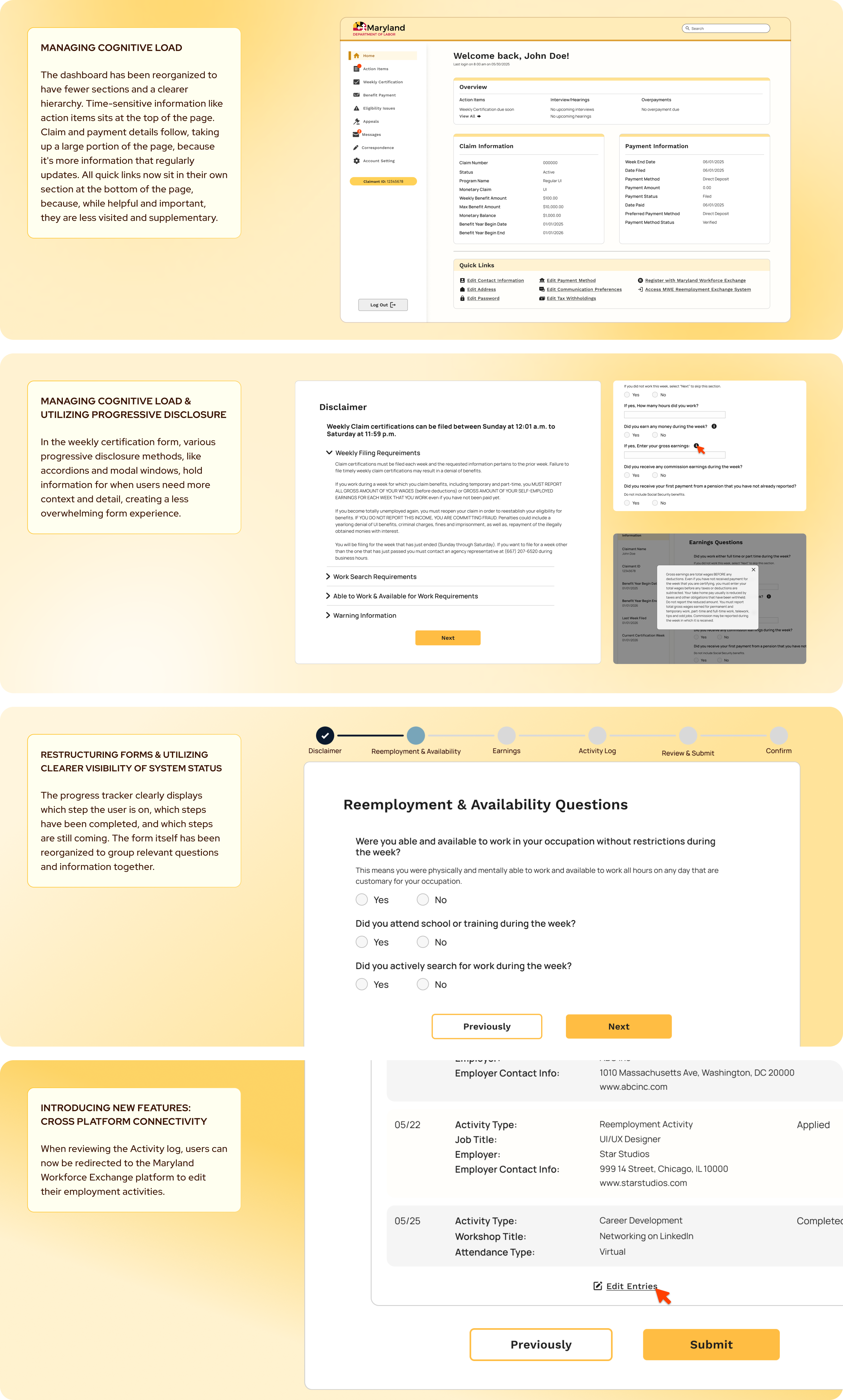 I explored what restructuring areas of the BEACON platform would look like to give users a clearer path to understanding their benefits and completing the weekly certification process. By restructuring the dashboard and simplifying the form flow, I created an experience that could reduce friction and confusion during a stressful and time-sensitive task.