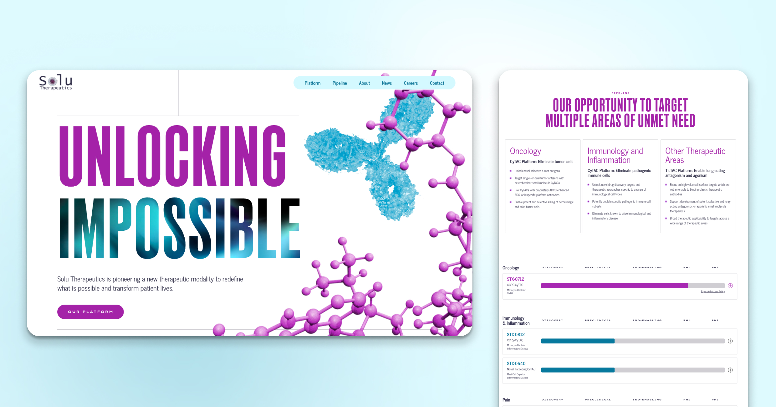 I architected Solu’s site structure and content flow to better show investors, scientific collaborators, and future employees their breakthrough platforms and rapid path from licensing to clinic, positioning them as pioneers advancing solutions for areas with high unmet need.